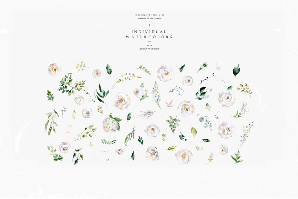 You're gifted with a collection of 150+ delicate watercolor elements and compositions of blooms and leaves. Some of them are created in pencil sketches style, others appear in tender pastel colors. The collection is also complemented with the watercolor textures and the golden alphabet with numbers. They will be perfect for growing bouquets in your invitations, frames, cards, posters, collages, and scrapbook creations. It's like a delightful touch of nature!